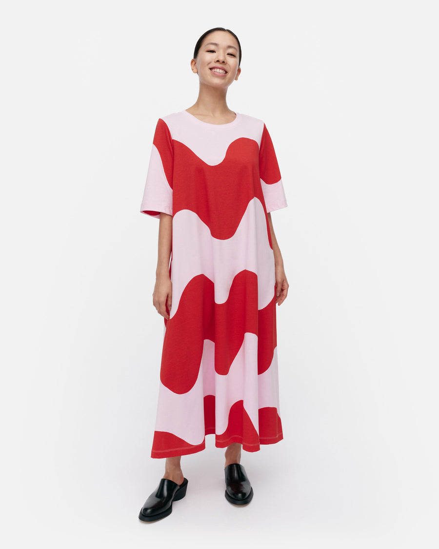 The Lokaali t-shirt dress is made of organic cotton jersey, and it has a relaxed, A-line fit. The dress features the Lokki pattern, a ribbed, open O-neck, and loose, elbow-length sleeves.