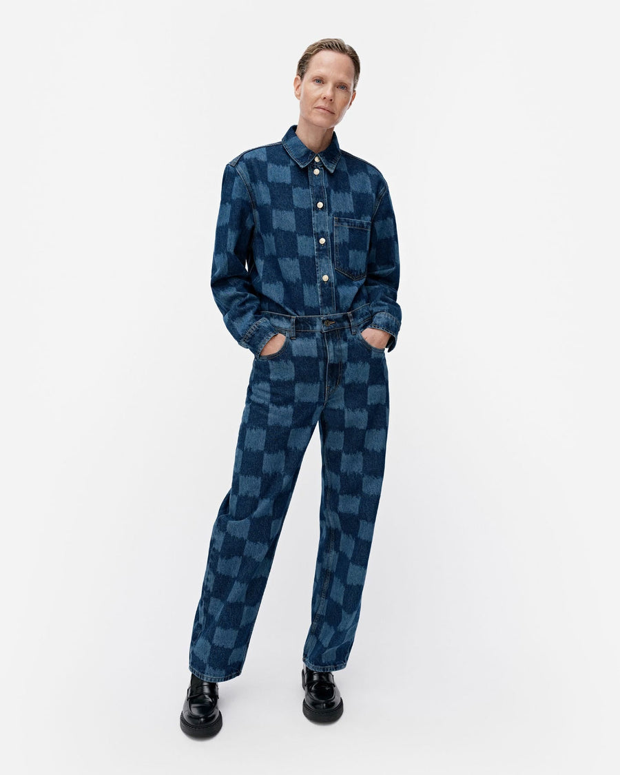 The mid-indigo Maridenim Barrel jeans are made of non-stretch cotton denim in the Jäkälä pattern. The 5-pocket jeans have a mid-rise waist with a relaxed fit and cropped legs with a curved cut. The jeans have Marimekko jean buttons and the Marimekko jean label in the back which is made of FSC-certified jacron-material.