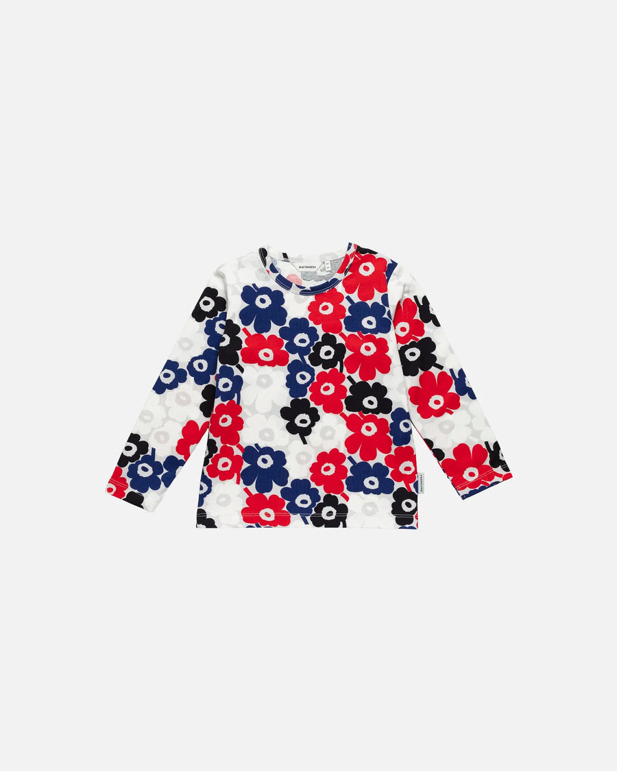 The kid’s Ouli cotton jersey top has a relaxed, straight fit and it is printed in the Mini Unikko pattern. The long-sleeved top has an O-neck.