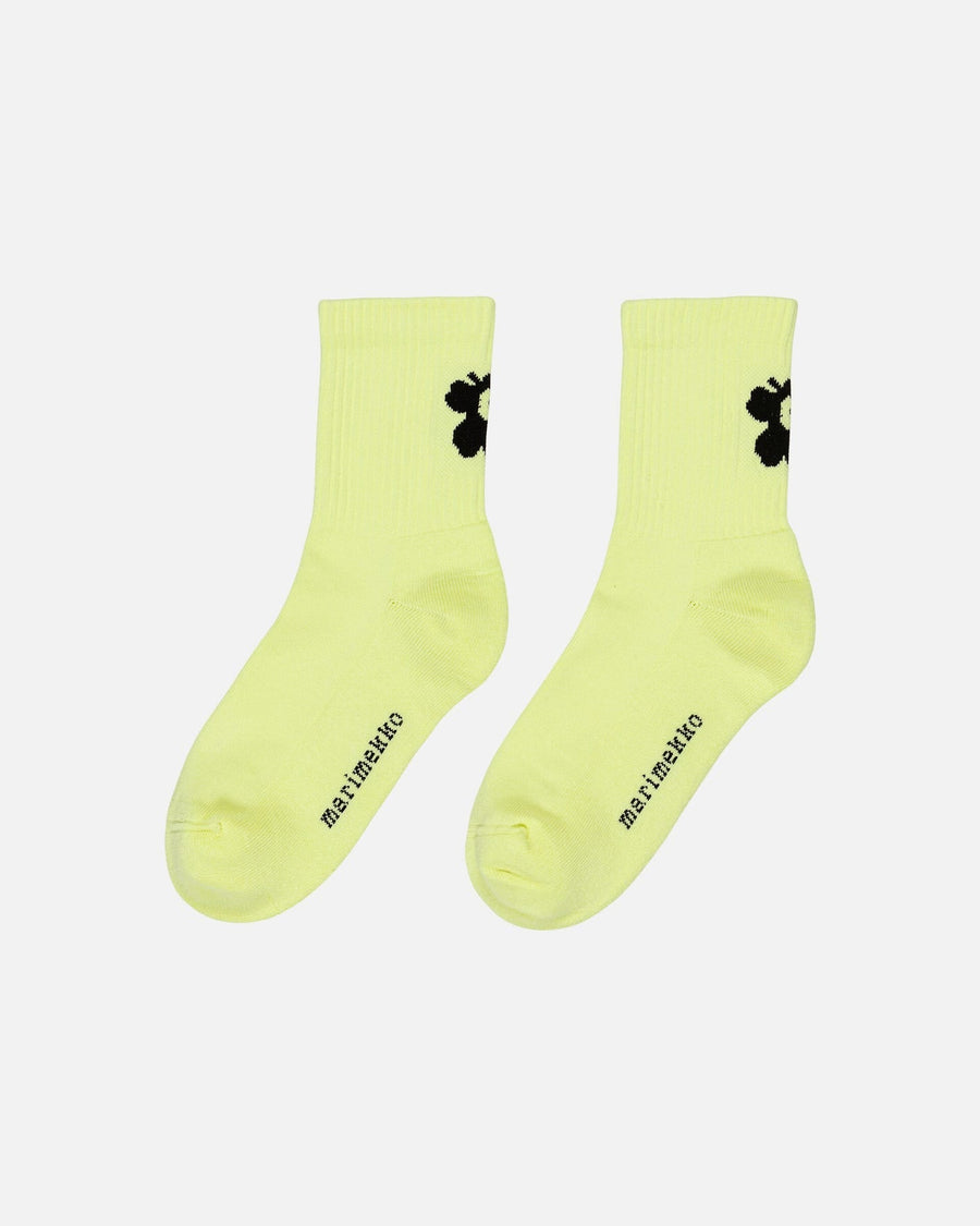 The Puikea tennis socks are made of a cotton blend and they feature the poppy flower of the classic Unikko pattern on the back of the sock leg.