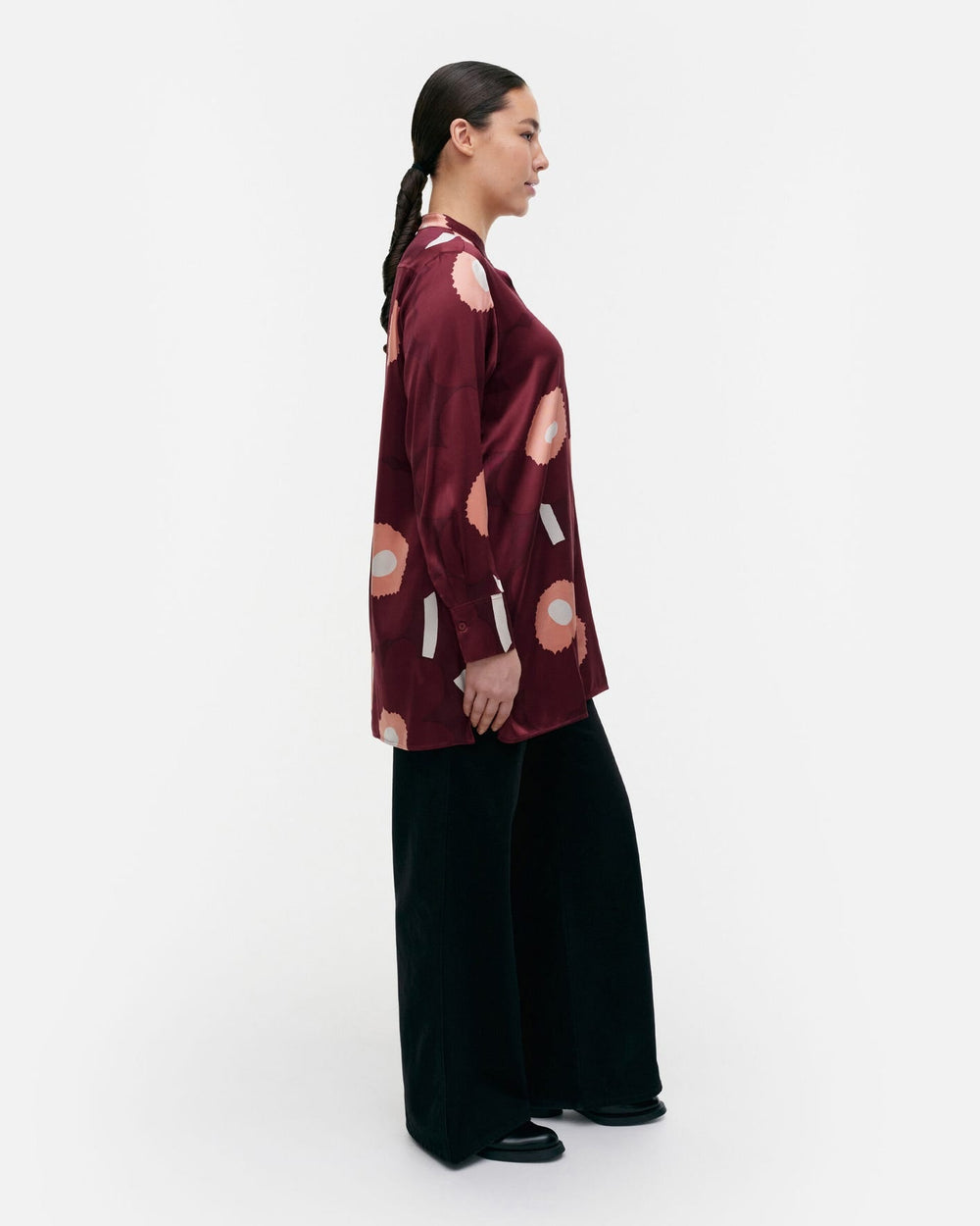 The Tiina silk tunic has a slim, A-line fit and it features the Unikko pattern. The product contains 5% elastane. The tunic has a standing collar and a short, concealed button list in the front that ends in a pleat. The tunic has cuffed sleeves with button closures, a back yoke seam with pleats, and side slits at the hem.