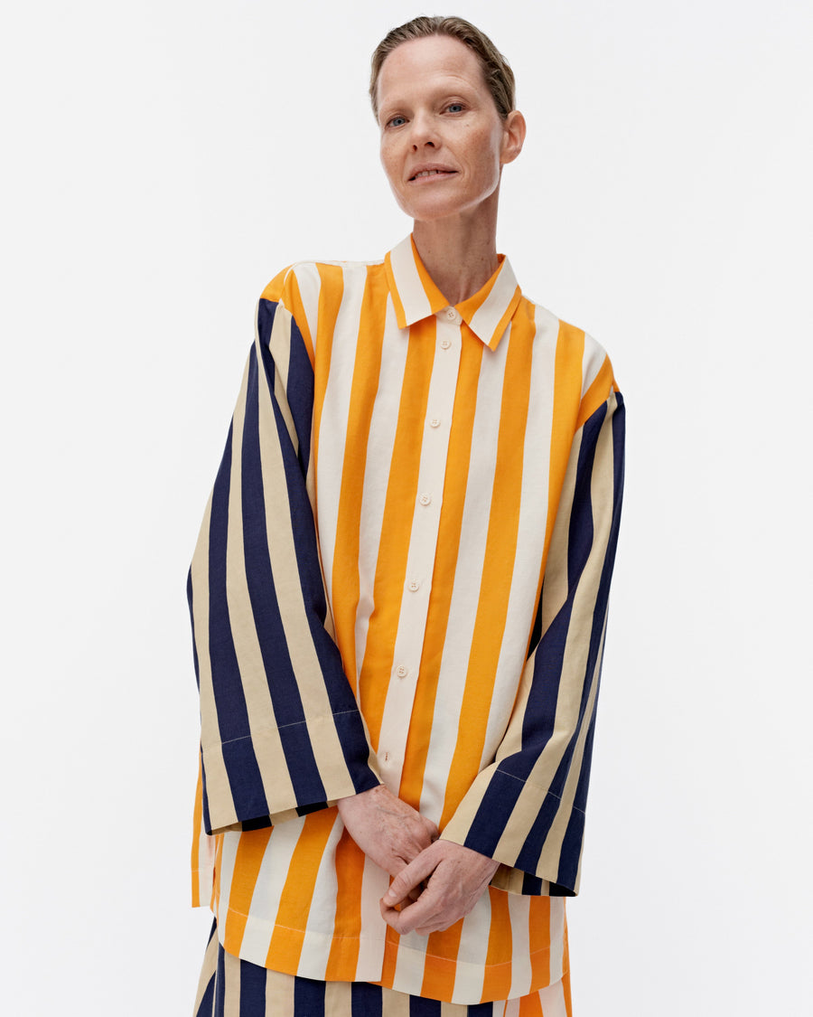 The Törmä button-up shirt is made of a cupro and linen blend and it has a relaxed, straight fit. The shirt features the Merirosvo pattern, and it has a button closure, a yoke seam with pleats in the back, and side slits at the hem. The long, loose sleeves are finished with a turned, stitched hem.