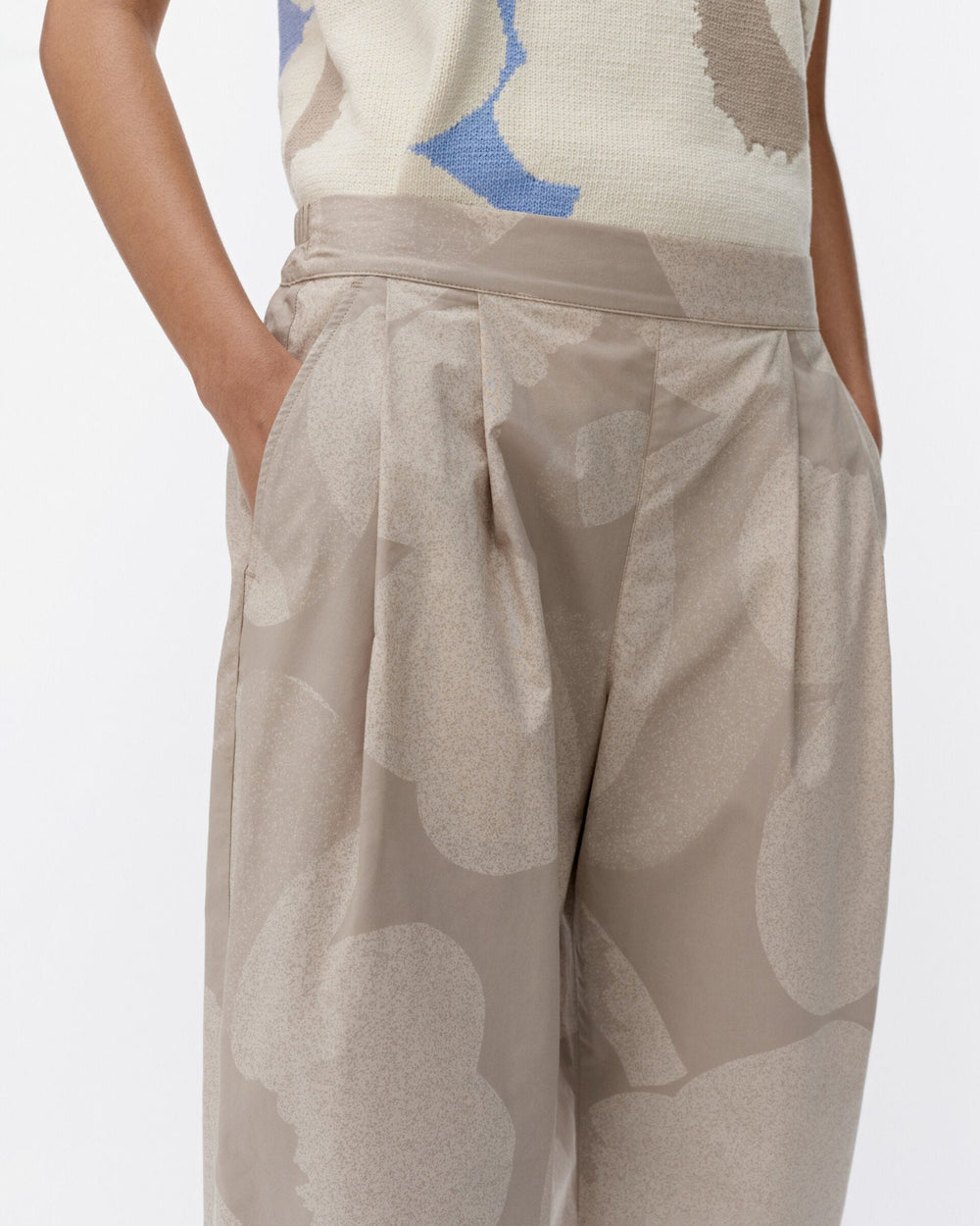 The Tuulla trousers are made of organic cotton, and they have a relaxed fit and wide trouser legs that narrow toward the cuffs. The trousers feature the Unikko pattern, which is printed in Helsinki. The front waistline is pleated, and the back waistband has an elastic gather. The cropped trousers have slanted side pockets.