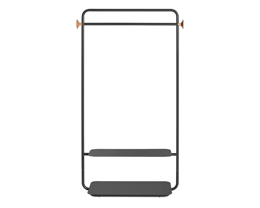 Show your clothes a good time. Garden Party is the perfect storage for people who have no storage. Durable powder-coated steel rack and shelves create a clean and quiet spot to stage outfits or showoff your full regalia. Solid white oak knobs provide an extra spot to hang accessories. Pair with Garden Party Shelving System and Storage Box for the closet of your dreams.