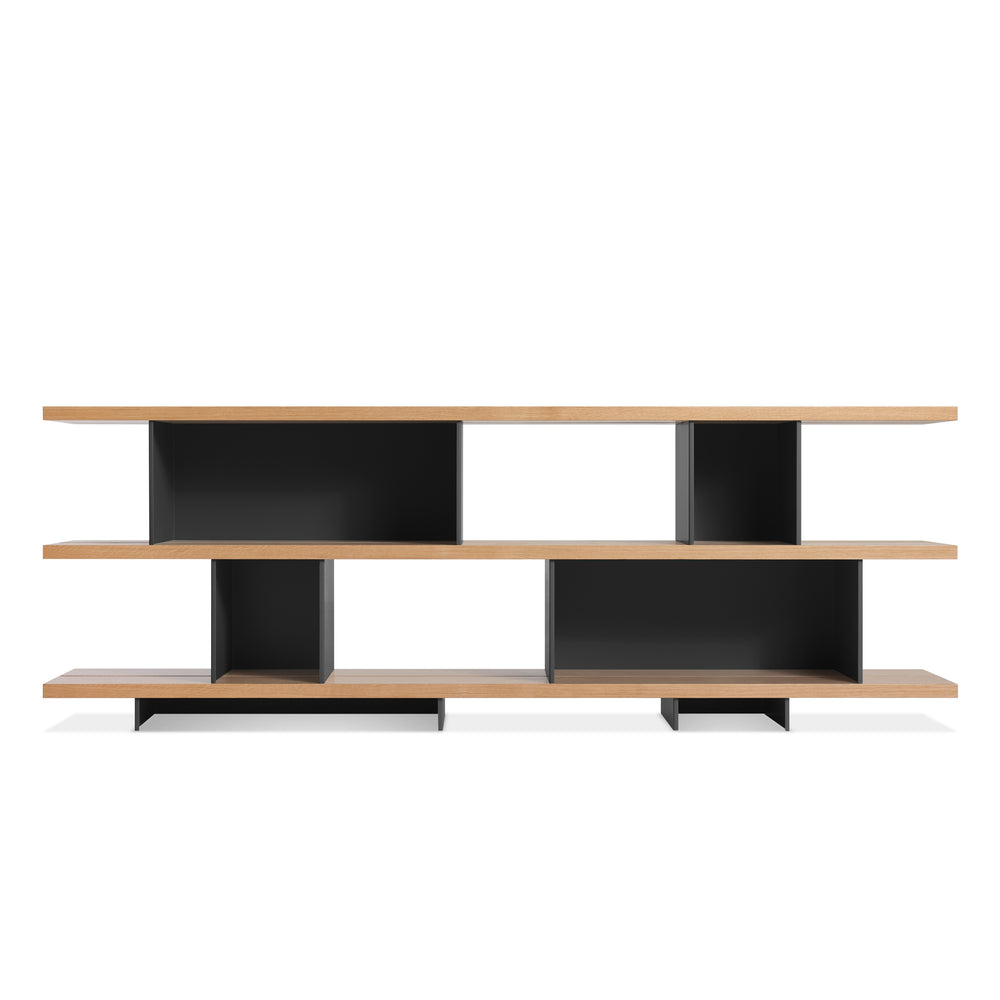Wood shelves with white oak or walnut veneers. Powder-coated steel. Anti-tip hardware kit included. Maximum height is four blocks tall.