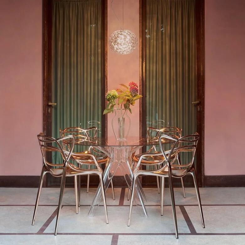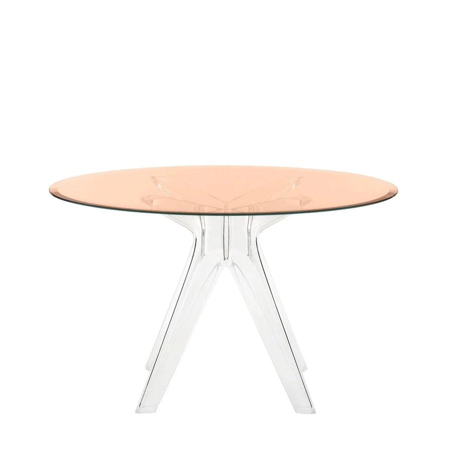 The Sir Gio table is characterised by a central leg created using a high-tech mould: the moulded plastic material conveys high performance and stability to support the glass top. The table offers the chance to combine different coloured bases and tops, for a wide range of different solutions.