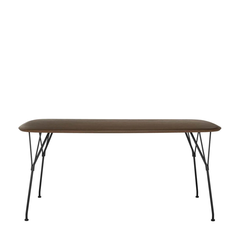The square and rectangular versions with four legs come in five sizes (100x100, 145x80, 160x90, 190x90 and 240x100) and three top finishes: light ash with two darker shades, flamed walnut and a third, characterised by thin strips of different tones of dark wood. The legs are in chrome or black.