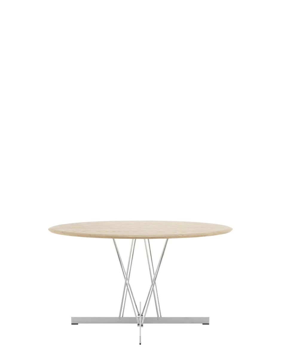 The square and rectangular versions with four legs come in five sizes (100x100, 145x80, 160x90, 190x90 and 240x100) and three top finishes: light ash with two darker shades, flamed walnut and a third, characterised by thin strips of different tones of dark wood. The legs are in chrome or black.