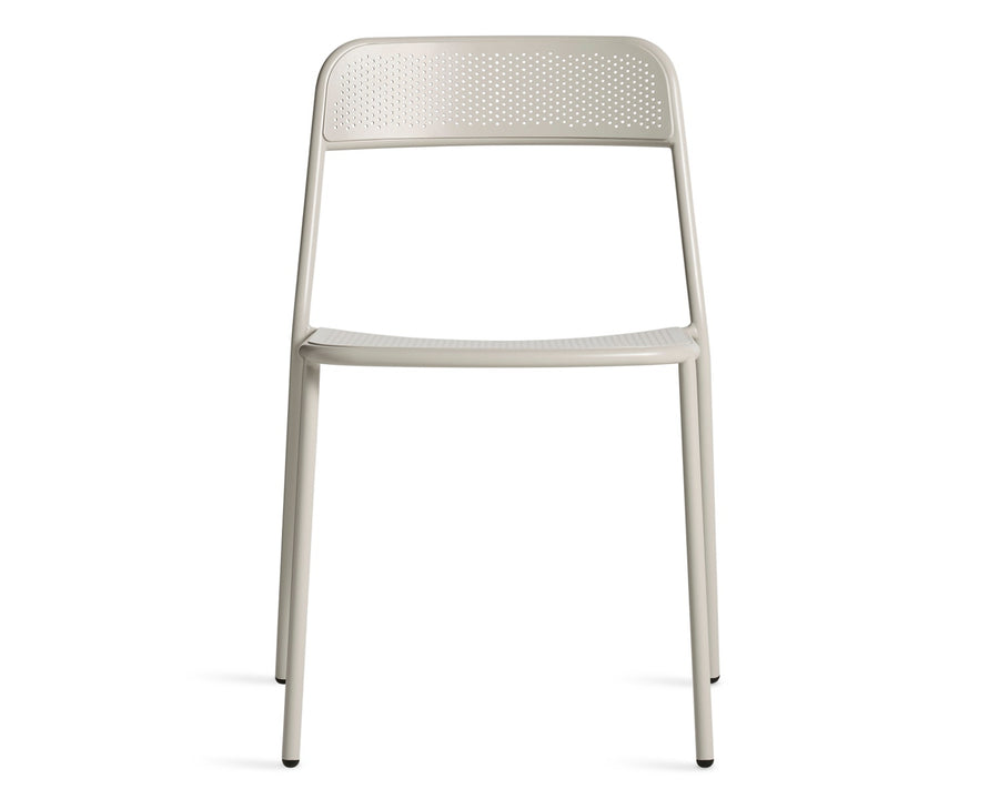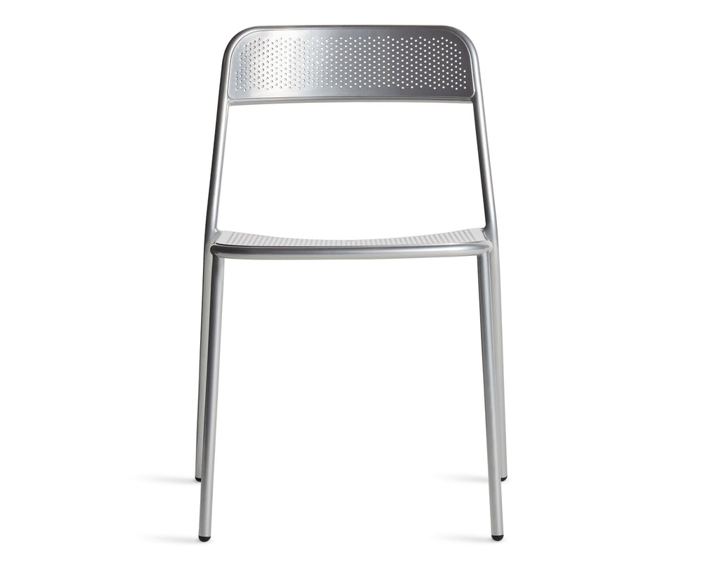Whatever you do, don't call it basic. Clean lines and sophisticated geometry form a minimal outdoor chair that's everything it's shaped up to be. Perforated seat and back detail apt for wowing guests and weathering the elements. Valid excuse to work, dine and stare off into space alfresco. Also available as an armchair .