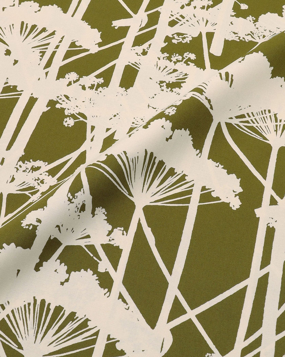 This linen fabric features the Kukat Puhkeavat pattern, which is printed in Helsinki.