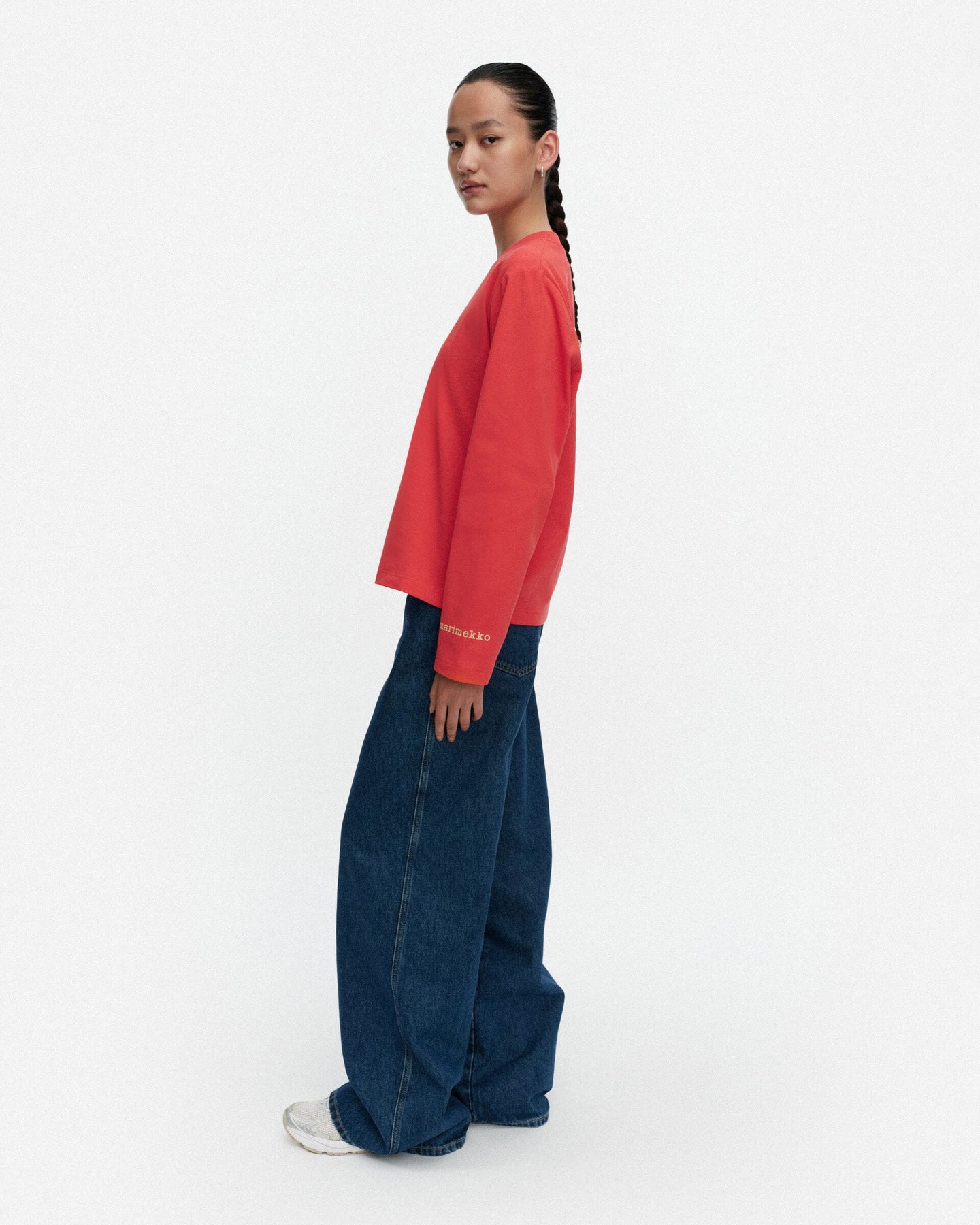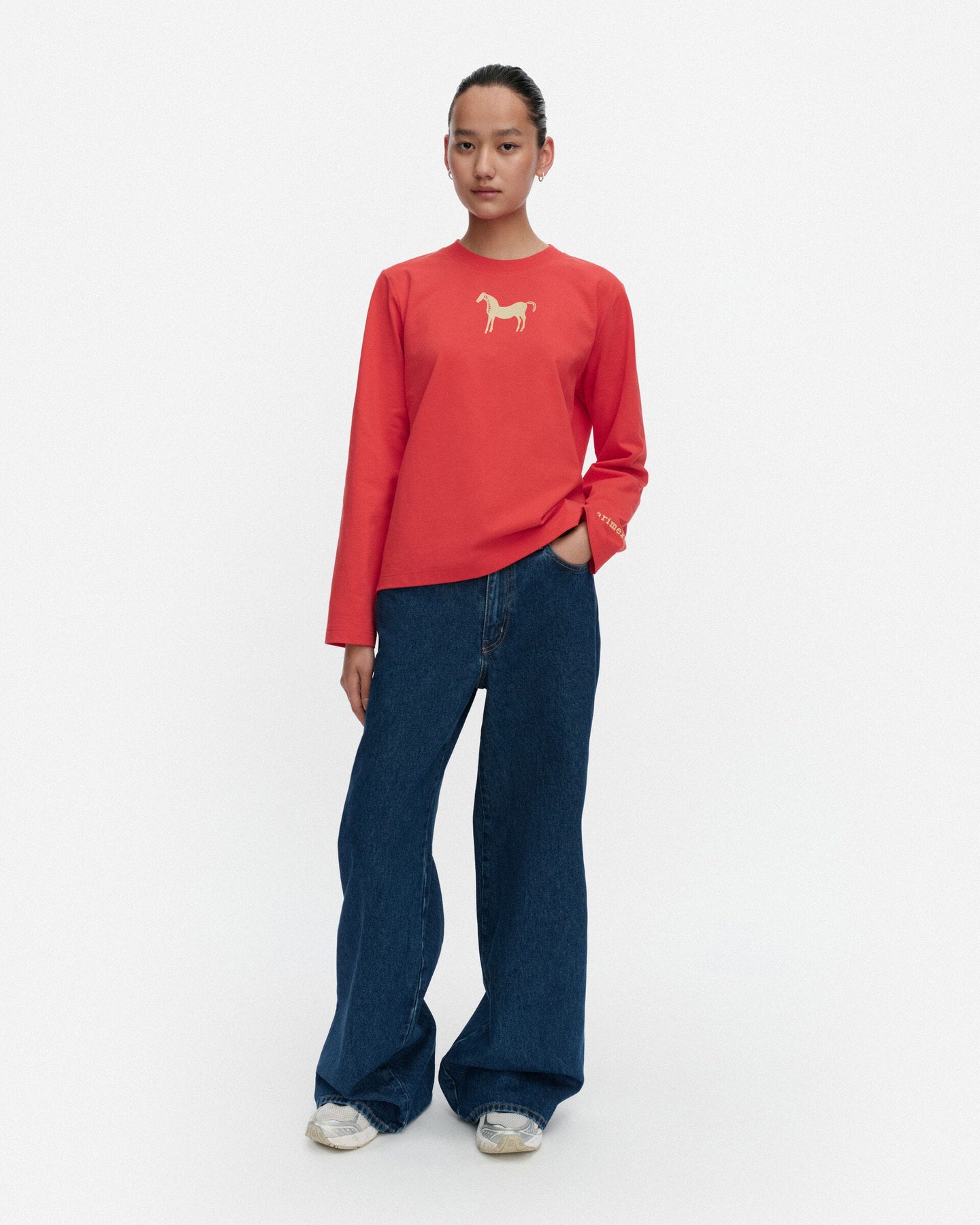 The Elve top has a relaxed fit. The long-sleeved top features the printed Musta Tamma pattern horse in the front and the Marimekko logo on the left sleeve end. The top has a ribbed O-neck.