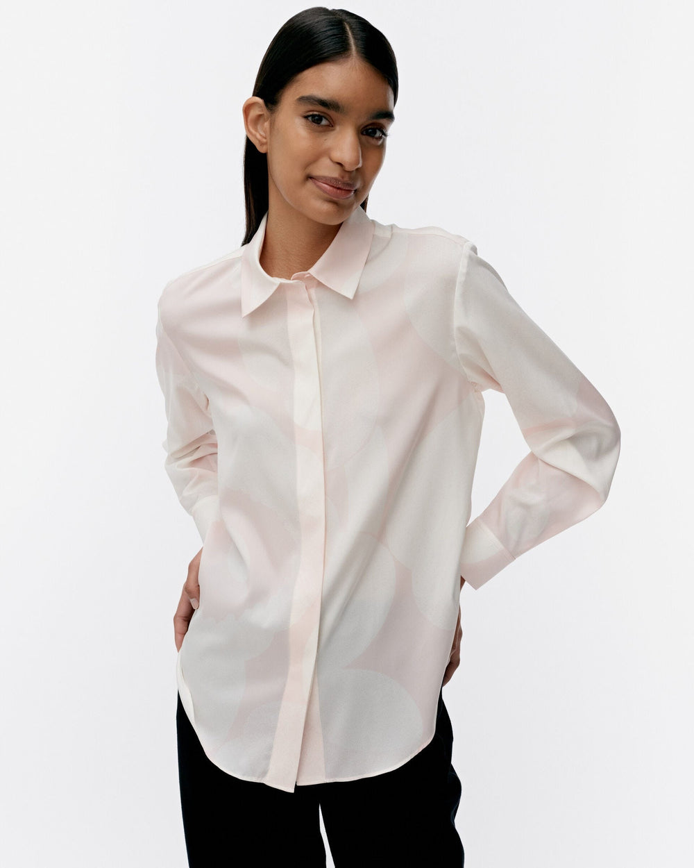 The Maija silk button-up shirt has a slim, straight fit and the Unikko pattern. The product contains 5% elastane. The shirt has a concealed button closure, a back yoke seam with pleats, and a curved hem with side slits. The cuffed sleeves have slits and button closures.