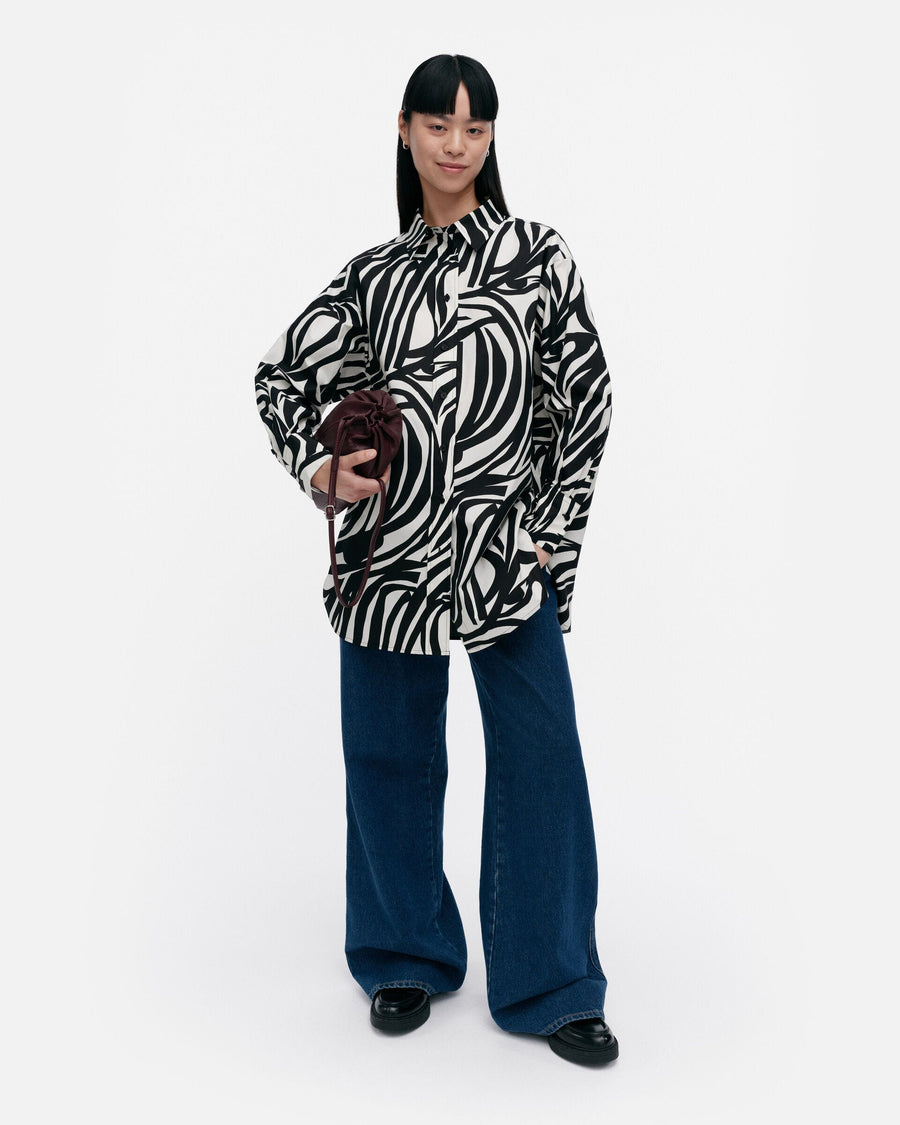 The Nila button-up shirt is made of organic cotton poplin, and it has an oversized, straight fit. The shirt is printed in the Jokuraita pattern, and it has a pointed collar, a button list, and cuffed sleeves with button closures. The curved hem has side slits.