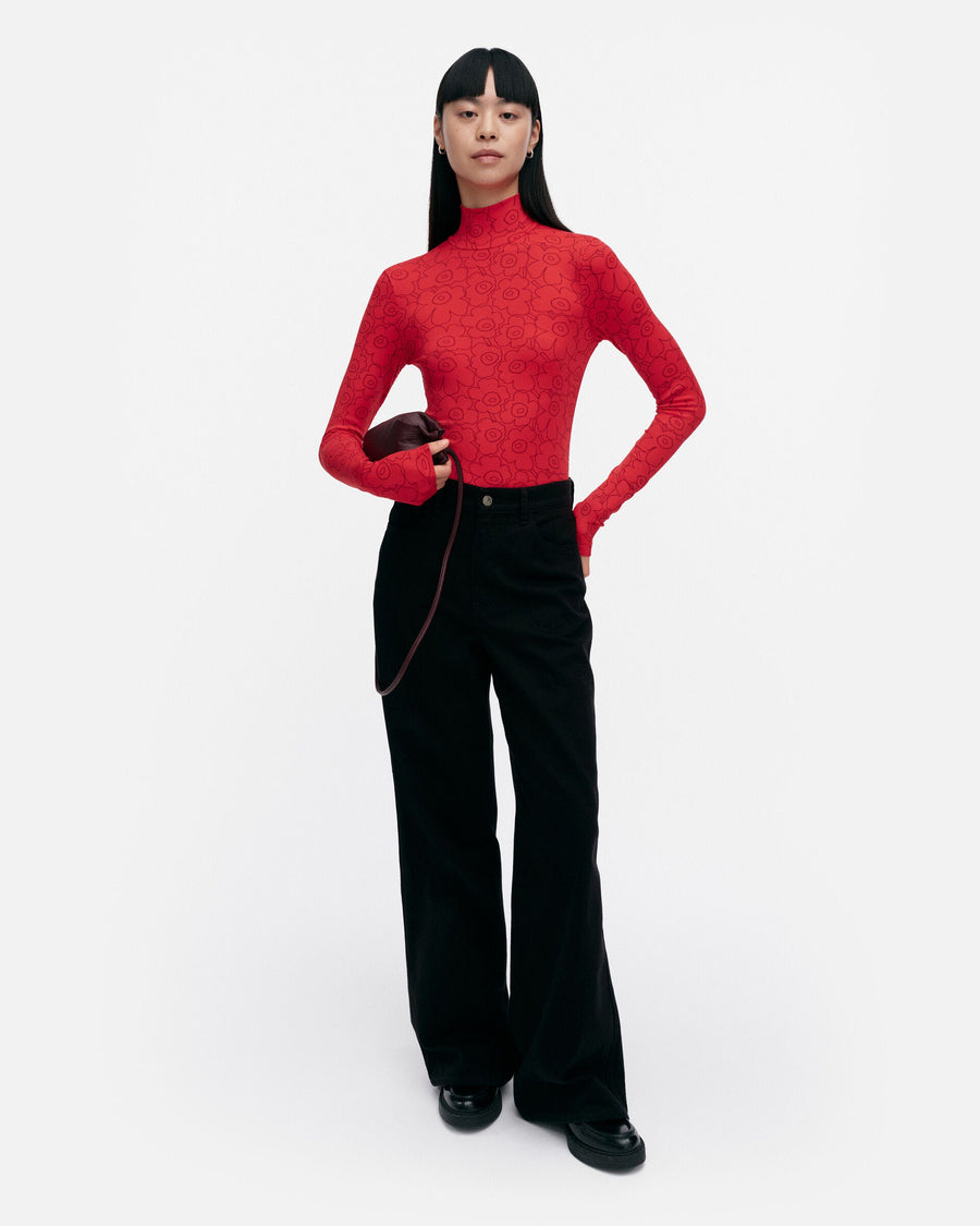 The Solmia rib jersey turtleneck has a straight, skinny fit and it features the Piirto Unikko pattern. The turtleneck has extra-long, slim sleeves.