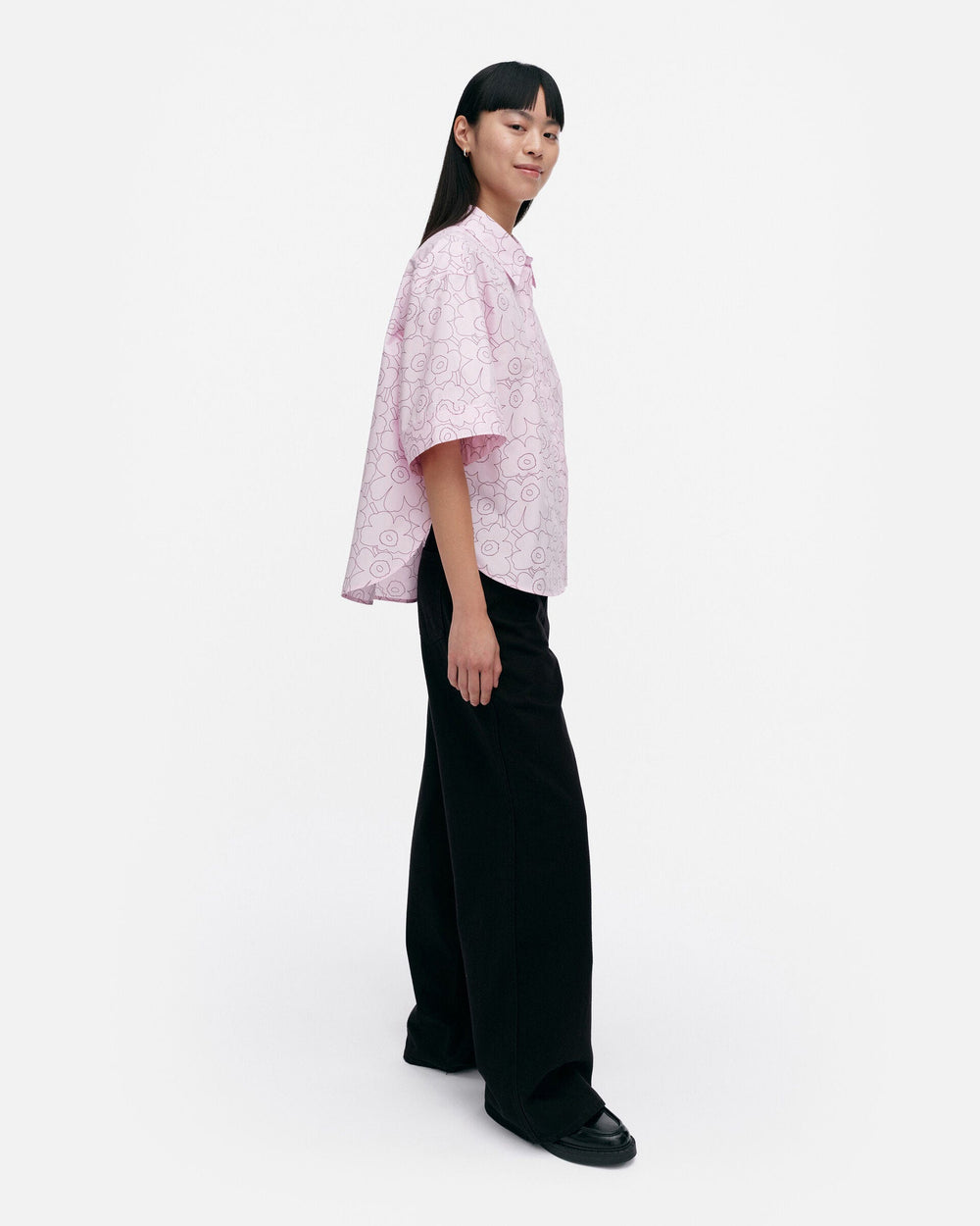 The Standardi organic cotton poplin shirt has an oversized, straight fit and it features the Piirto Unikko pattern, which is printed in Helsinki. The shirt has a pointed collar, a concealed button closure, and loose, elbow-length sleeves with narrow cuffs. There is a yoke seam and a pleat in the back and the hem has a curved cut and side slits.