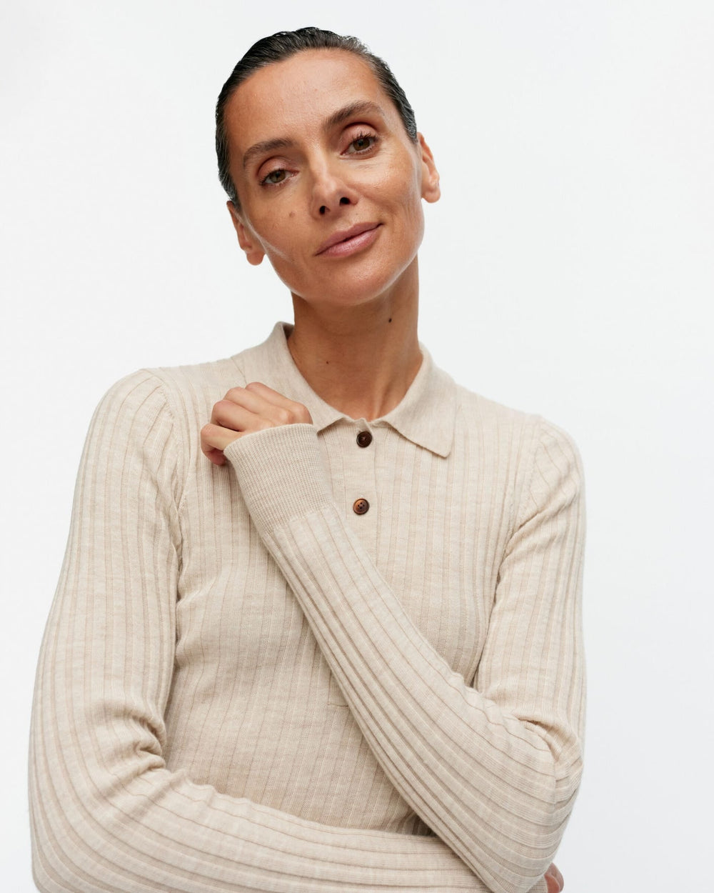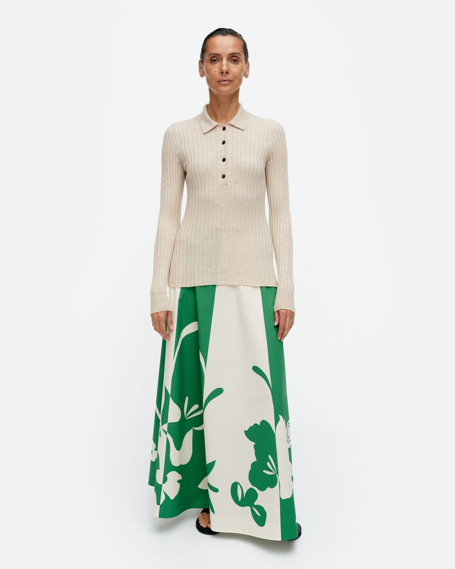 The Iitu knitted pullover has a straight, skinny fit and is made of extra fine merino wool rib, which is certified. The pullover has a polo collar, a short button list in the front, and ribbing at the sleeve ends.