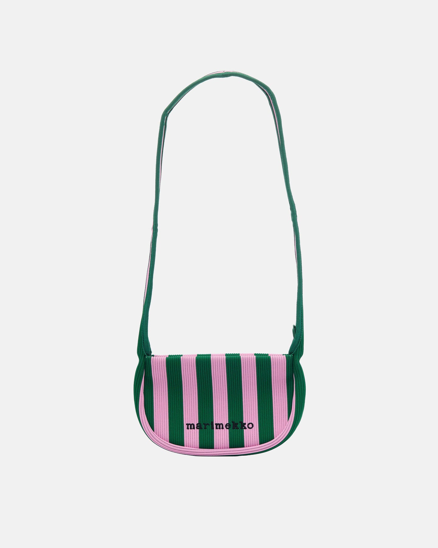 The Knitted Crossbody bag features the jacquard knit Merirosvo pattern. The firm bag has a ribbed look, a shoulder strap, a zipper closure, and the embroidered Marimekko logo on the front.