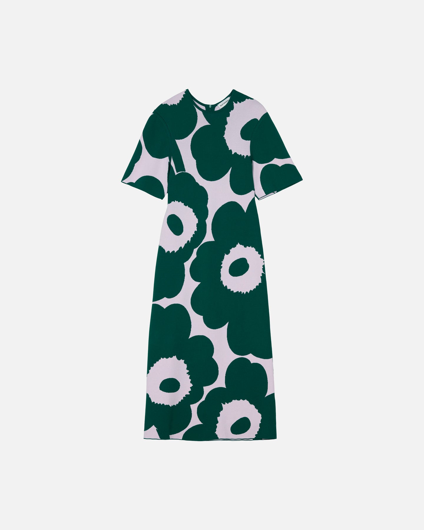 The Muunnos knit dress has a slim, straight fit, and it features the jacquard knit Unikko pattern. The dress has an O-neck with a tubular finish and a concealed zipper in the back seam. The dress has short sleeves that are dropped at the shoulders and have tubular finishes at the armhole seams.