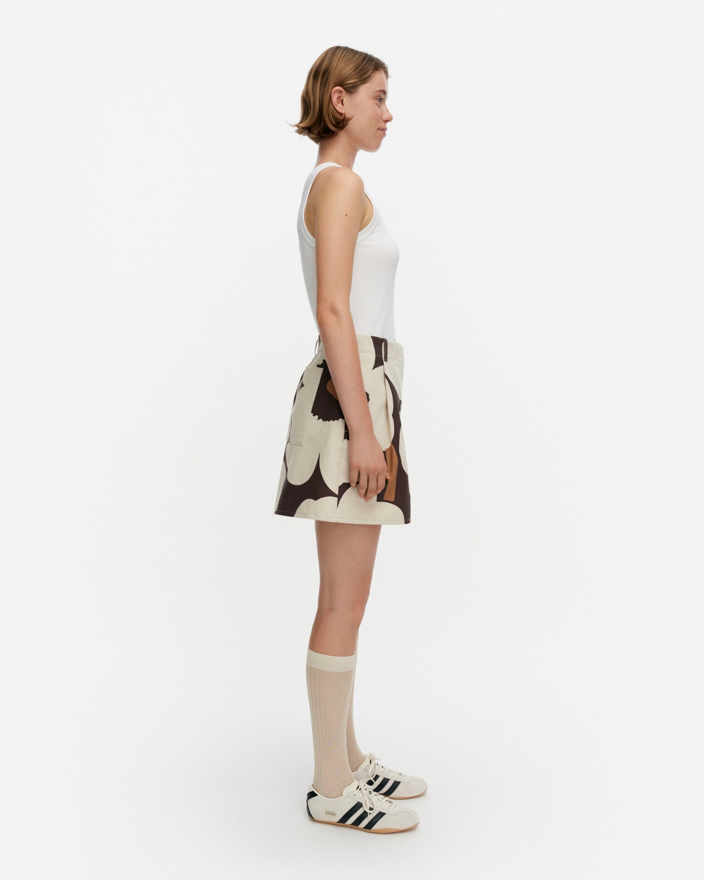 The Pruukat shorts have a relaxed fit, wide trouser legs, and they feature the Unikko pattern, which is printed in Helsinki. The pleated shorts have a zipper with a hook and eye closure in the front, side seam pockets, and one patch pocket in the back. The darts in the back waistline give the shorts a snug fit at the waist. There are belt loops at the waistline.