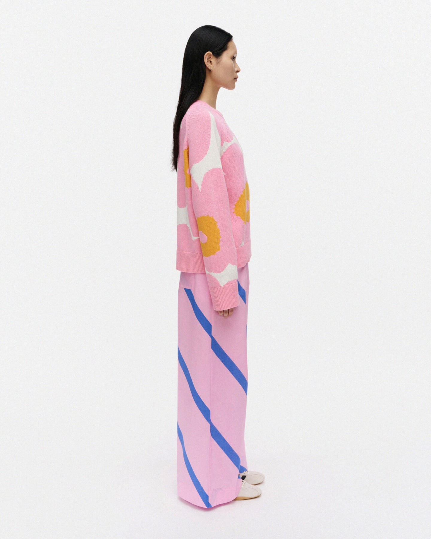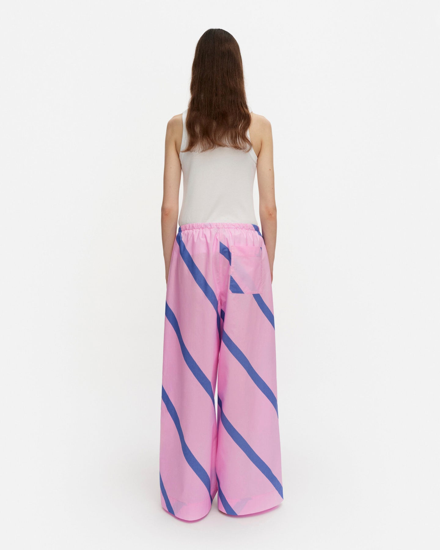 The Puoti trousers have a relaxed fit and long, wide trouser legs. The trousers feature the Basso pattern, which is printed in Helsinki. They have an elastic waistband with drawstrings, side seam pockets, and one patch pocket in the back.