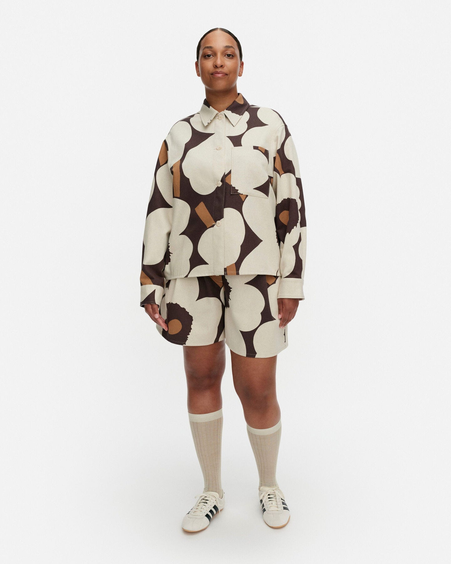 The Pilkkoa overshirt has a relaxed, straight fit, and it features the Unikko pattern, which is printed in Helsinki. The overshirt has a pointed collar, a button closure, and one chest pocket. The sleeves have slits, pleats, and button closures at the cuffs. There is a yoke seam in the back.