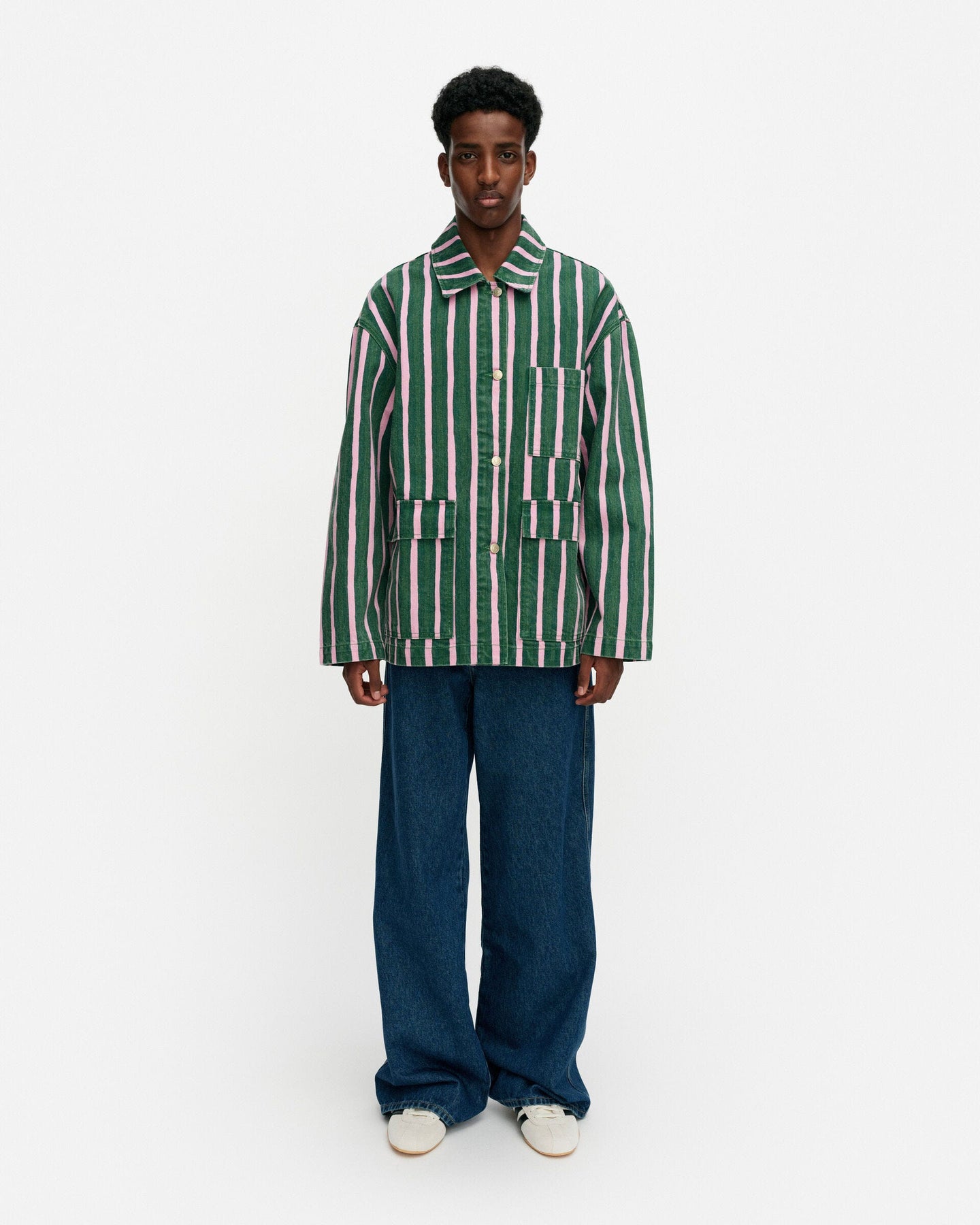 The Poweri jean jacket is made of non-stretch cotton twill in the Piccolo pattern. The jacket has a relaxed fit, a shirt collar, a button closure, and one chest pocket. The jacket has flap patch pockets in the front, and it features Marimekko jean buttons.