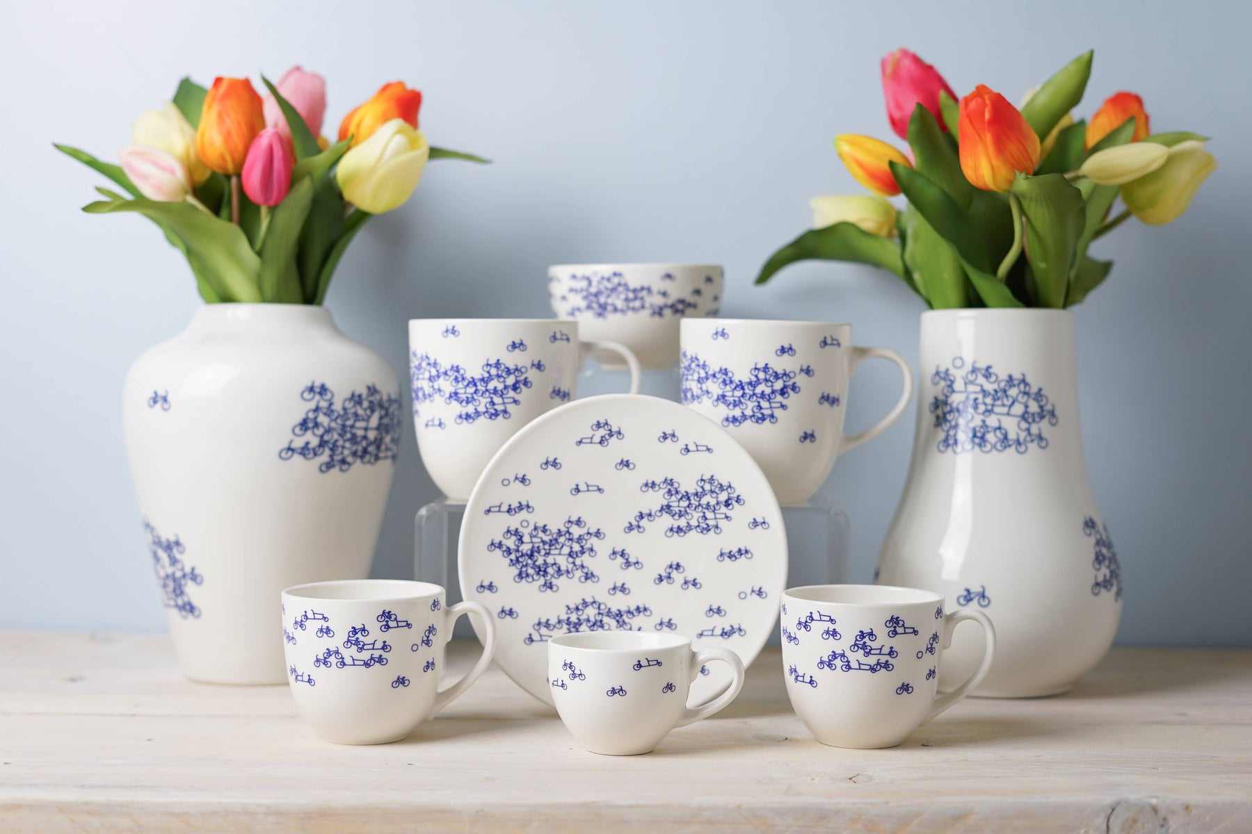 Two trendy dessert plates from the collection The Blue Bicycle. This collection is a design by the French illustrator Sylvain Tegroeg for Heinen Delfts Blauw. The Frenchman draws his inspiration from the many bicycles whizzing by everywhere in the Netherlands. Especially in the eyes of foreign visitors, the number of bicycles in the Netherlands is a fascinating phenomenon. In The Blue Bicycle collection, two quintessentially Dutch elements come together: Delft blue and bicycles. The illustrator has chosen a sketch-like illustration style to give the collection a fresh and modern look. At first glance, it looks like a swarm of bicycles on the dessert plate, but the longer you look at the picture, the more different types of bicycles you see. From the beloved and seasoned granny bike to a fully loaded cargo bike. It's rush hour on this dessert plate!