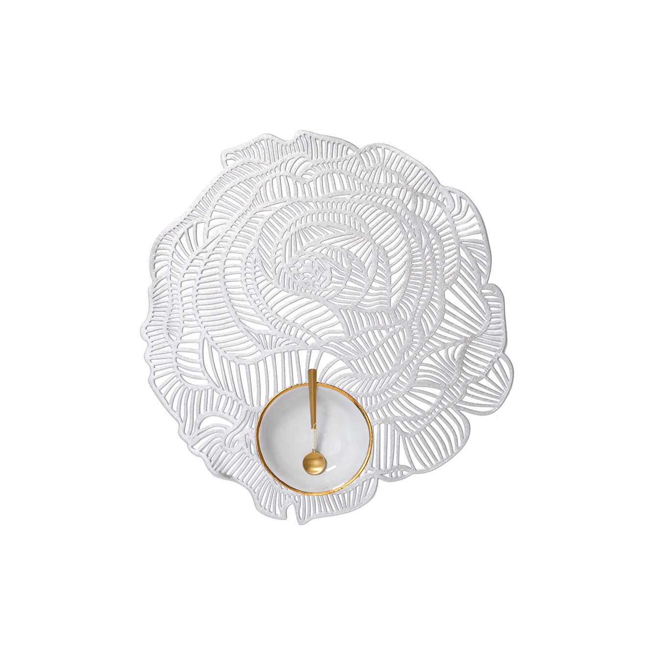 At once realistic and playfully stylized, Rose is a celebration of the timeless flower through a single high-centered bloom. Graphic lines and modern metallic hues add dimension to layers of opened petals, which give the rounded shape an organic character.
