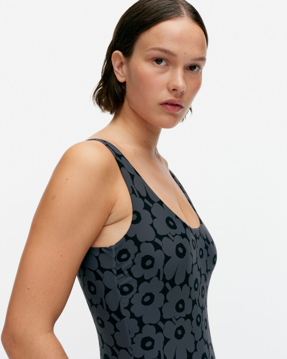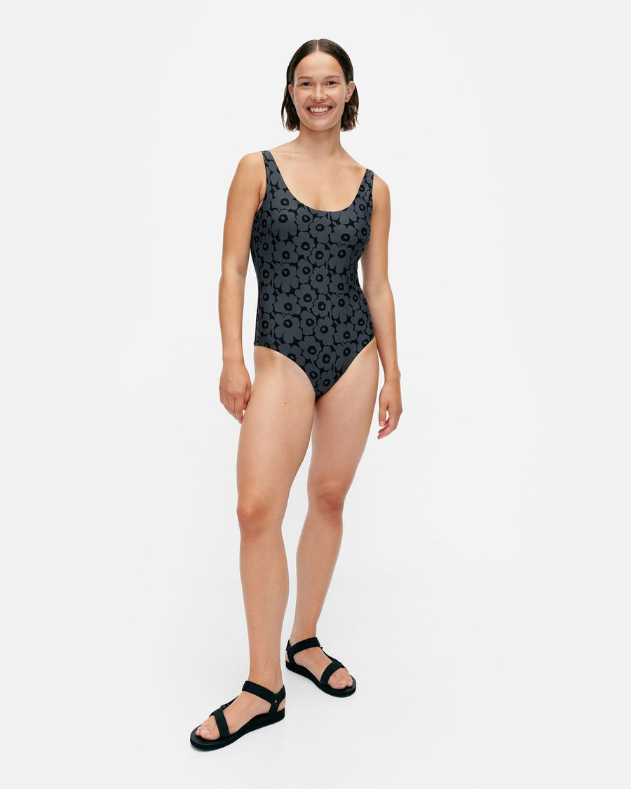 The Agnetha swimsuit features the Unikko pattern. The fully lined swimsuit has adjustable shoulder straps and a low back. The material has a UPF 50+ rating.