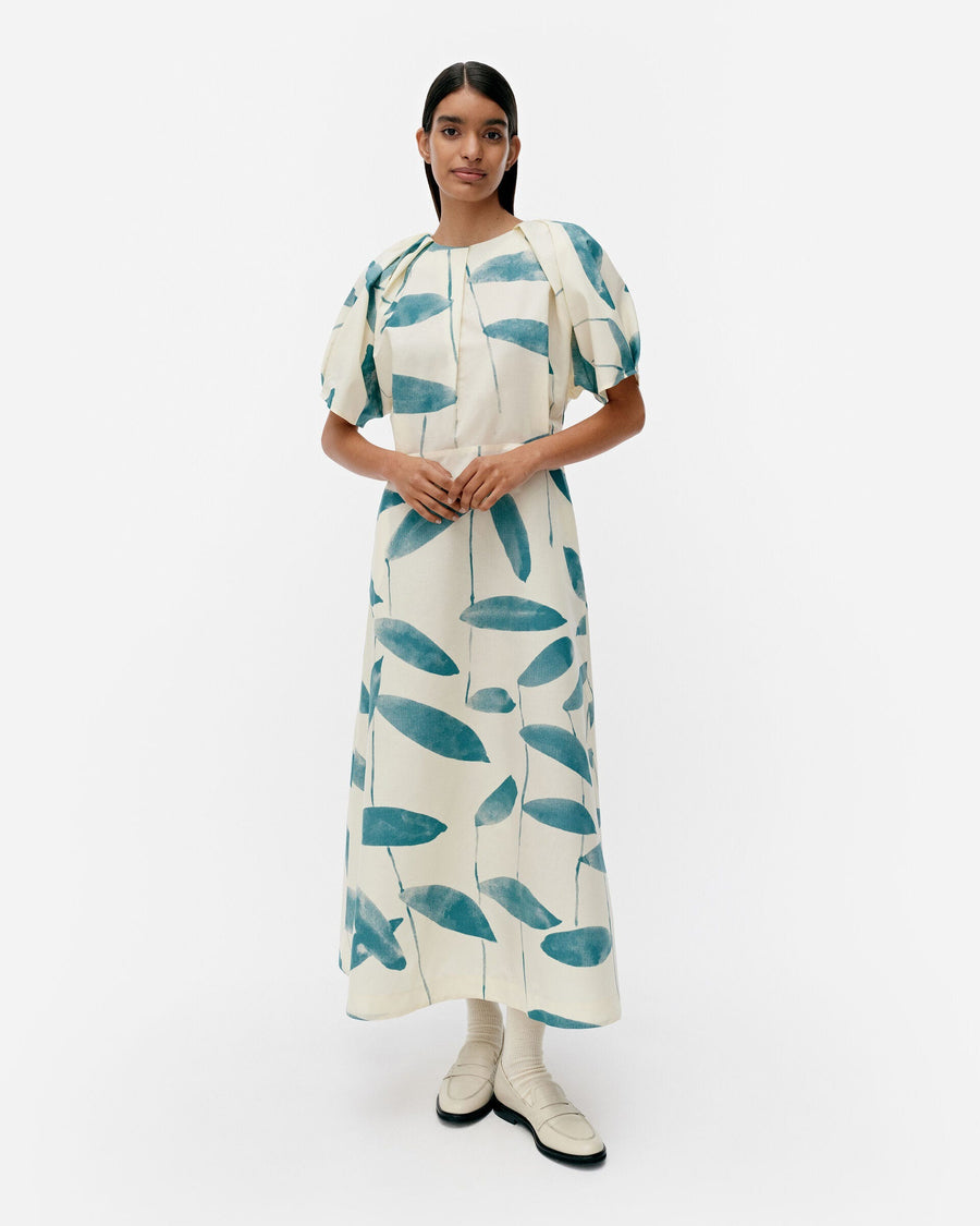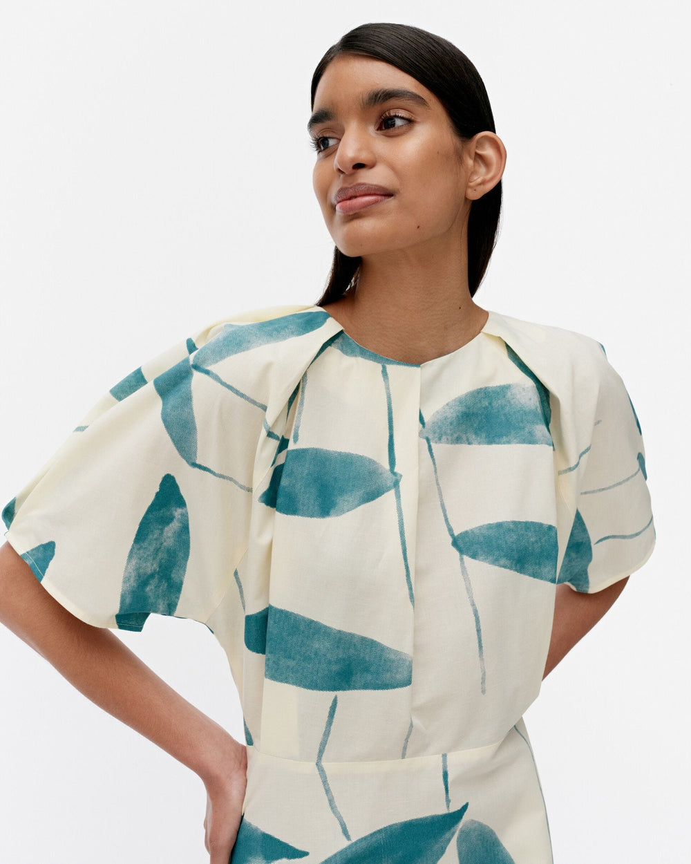 The Anatomia dress is made of a cotton and linen blend, and it has a slim fit, a straight top, and a flared cut hem. The dress features the Paju pattern, which is printed in Helsinki. It has a pleated O-neck, a concealed zipper in the back seam, and short, voluminous raglan sleeves. The waist seam is pleated and there are pockets in the side seams.