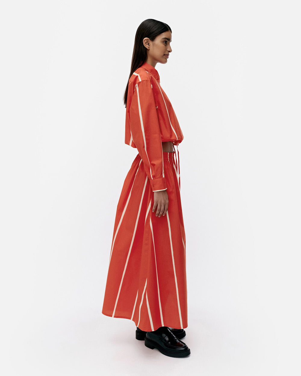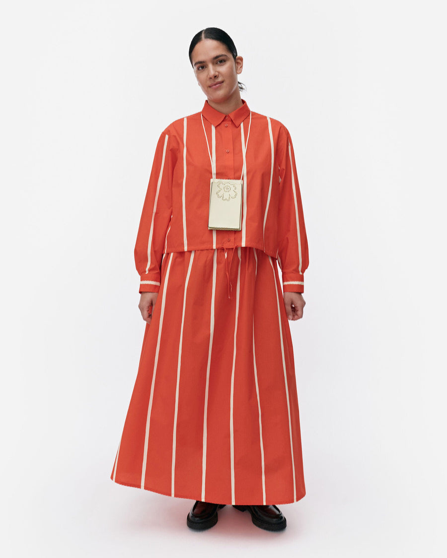 The Buklee skirt is made of organic cotton poplin, and it has a relaxed, A-line fit. The skirt features the Puhveli pattern, which is printed in Helsinki. The skirt has an elastic waistband and side seam pockets.