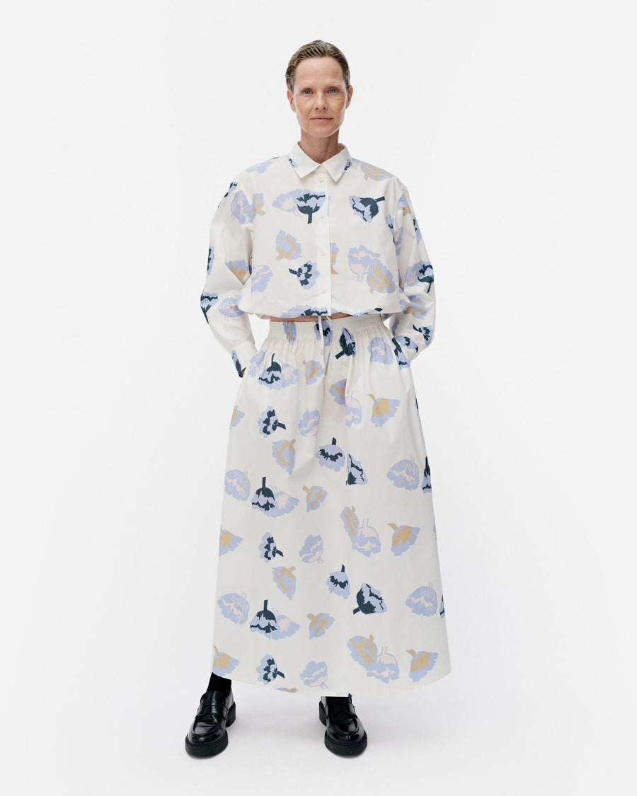 The Buklee skirt is made of organic cotton poplin, and it has a relaxed, A-line fit. The skirt features the Suitsuke pattern, which is printed in Helsinki. The skirt has an elastic waistband and side seam pockets.