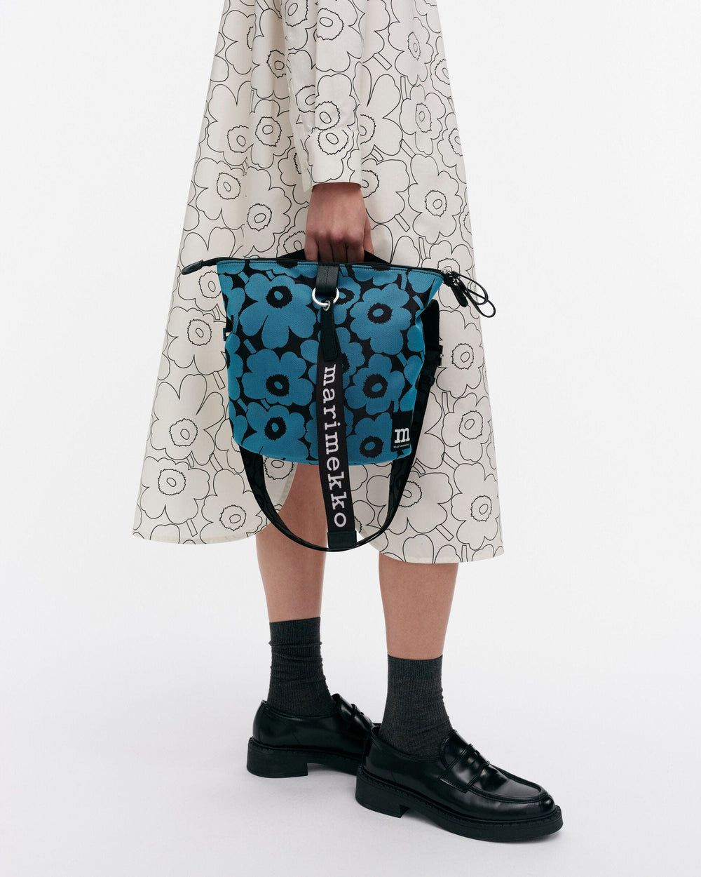The Carry All Unikko shoulder bag has a zipper closure, a handle, and an adjustable, jacquard knit Unikko pattern shoulder strap. There is an open pocket on the inside and an open pocket on the outside. The Marimekko keychain is attached to the front.