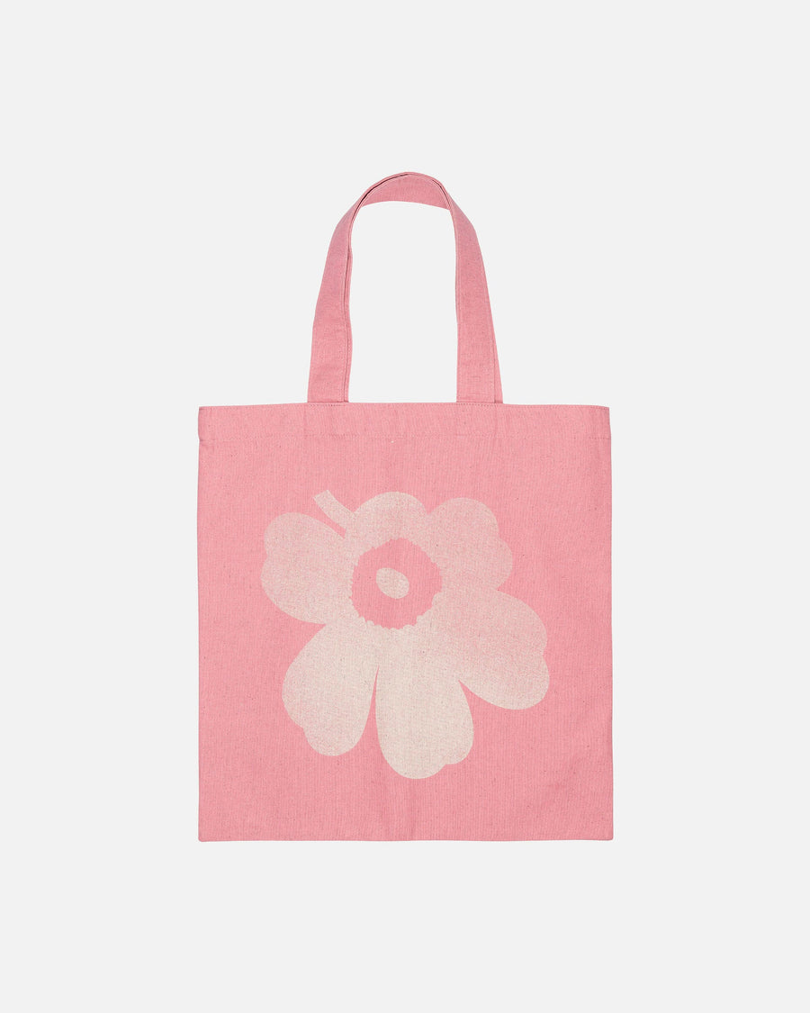 The Vankka tote bag is made of a firm cotton and linen blend, and it features the large Akvarelli Unikko pattern, which looks like it was painted with watercolours.