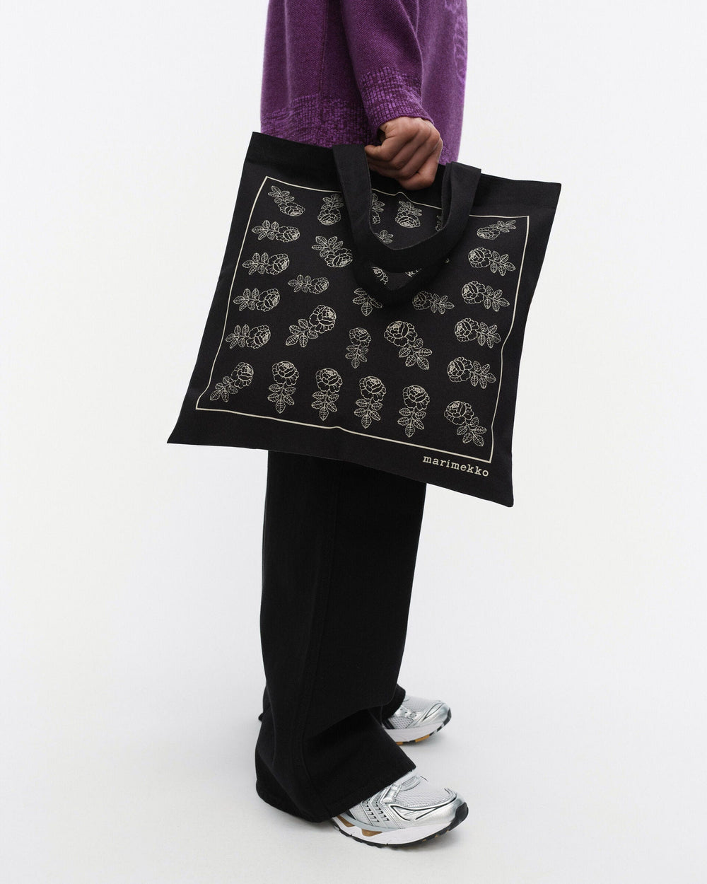 The Vankka tote bag is made of a firm cotton and linen blend, and it features the Vihkiruusu pattern.