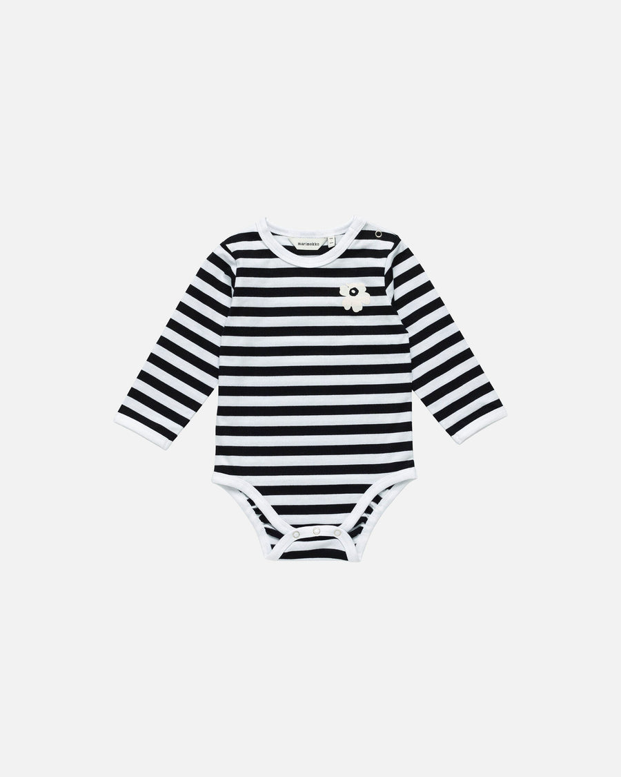 The long-sleeved Vinde bodysuit is made of organic cotton jersey in the Tasaraita pattern. The Unikko flower is printed in the front. There is a snap button closure on the left shoulder and a triple snap button closure on the bottom. The neckline, sleeve ends, and leg openings are ribbed.