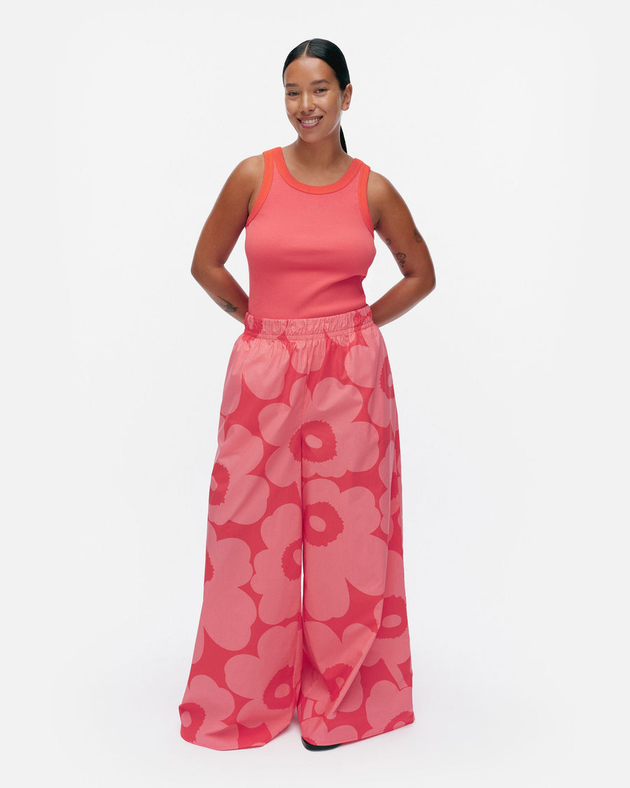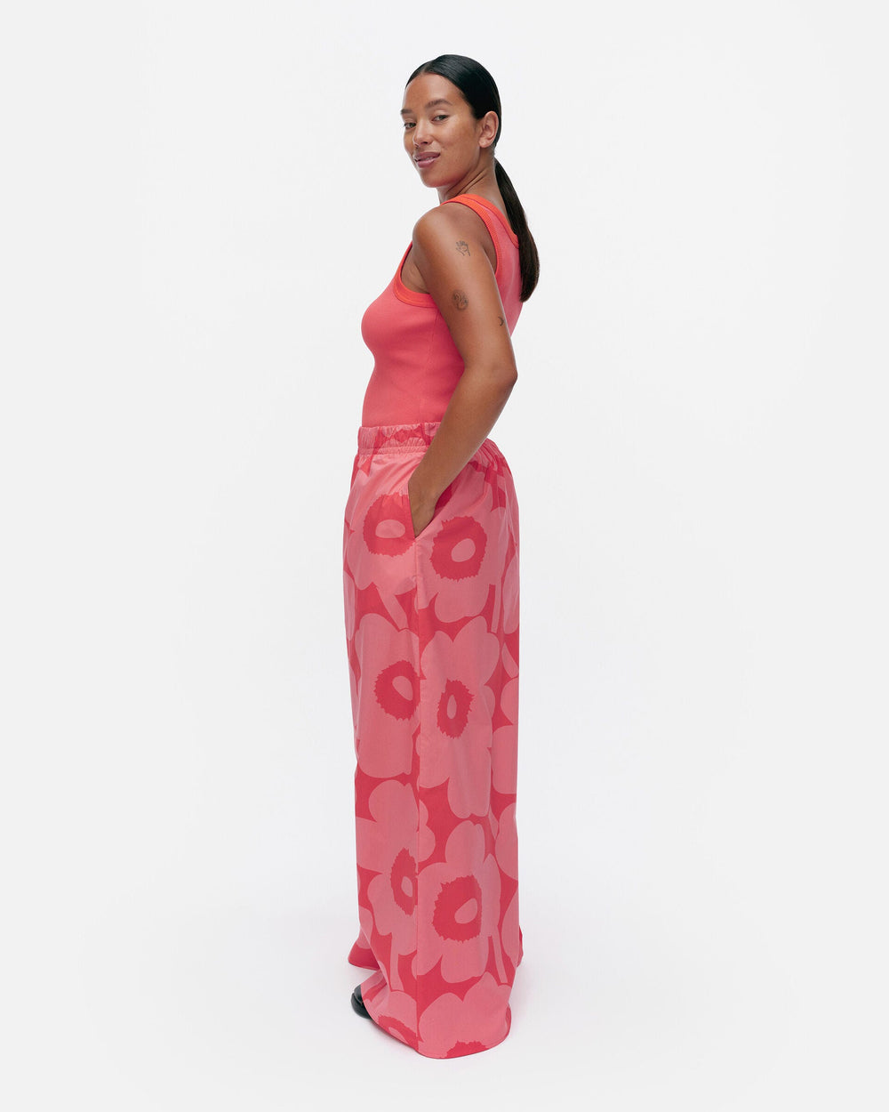 The Voimakukka trousers are made of organic cotton poplin, and they have a relaxed fit and wide trouser legs. The trousers feature the Unikko pattern, an elastic waistband, and side seam pockets.