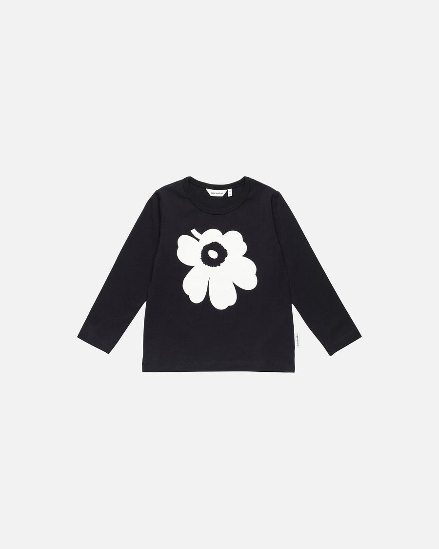 The kids’ Yksi organic cotton jersey top features the large printed Unikko flower in the front. The product contains 4% elastane. The long-sleeved top has a ribbed O-neck.