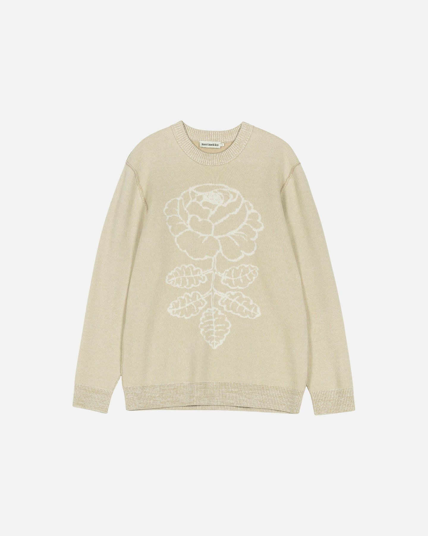 The Ruusut knitted jumper has a relaxed, unisex fit. The jacquard knit jumper features the large Vihkiruusu flower in the front and its seams are visible on the right side. It has a double-ribbed O-neck and wide ribbing at the sleeve ends and hemline.