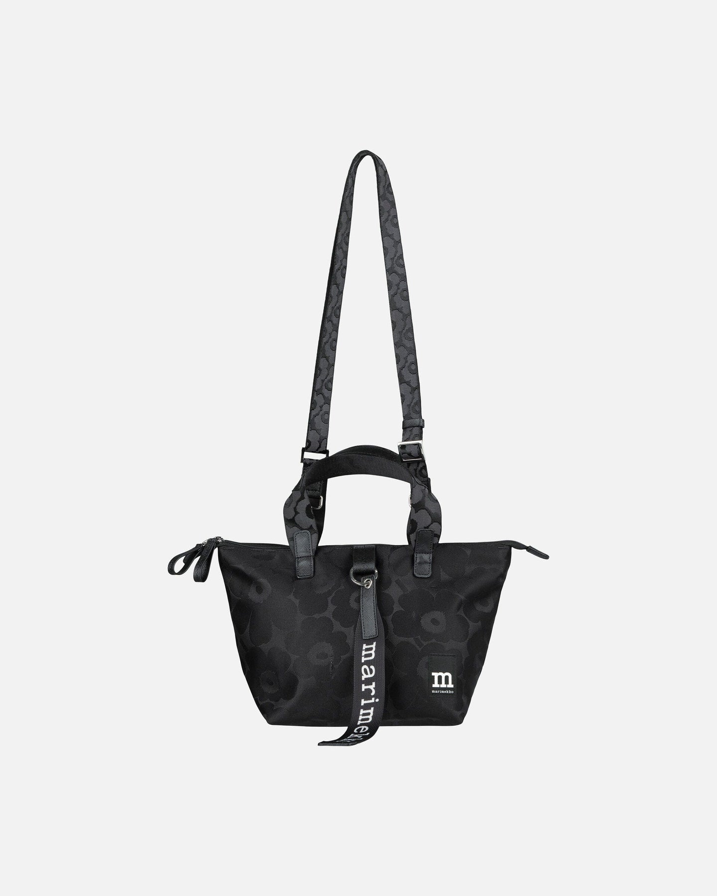 The Tote S shoulder bag features the jacquard knit Unikko pattern. The bag has a zipper closure, a handle, and an adjustable shoulder strap. The inside is lined, and it has one slip-in pocket. The front features the Marimekko logo label and the Marimekko keystrap that is attached with a D-ring.